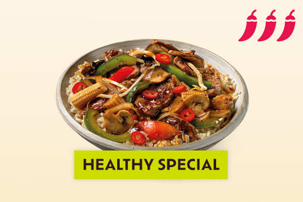 Black chilli, steak, brown rice, mushrooms, broccoli, bean sprouts, onion, bell pepper, baby corn, topping fresh chilli. Compiled by Naomi Brinkmans, sports dietitian with the NKVB (Royal Dutch Football Association), among others.