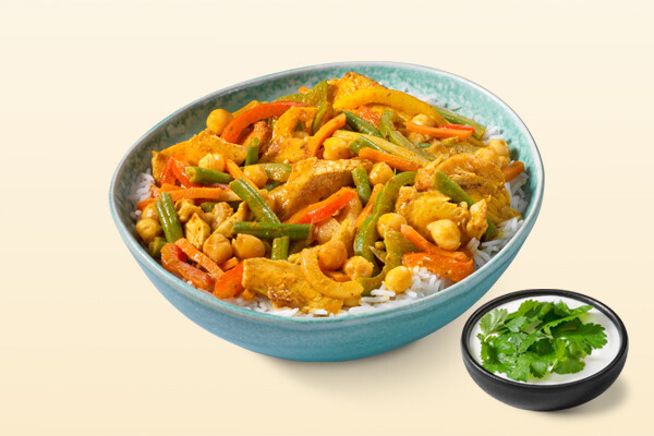 Indian chicken tikka masala with delicious tender chicken breast, rice, green beans, bamboo shoots, carrots, bell peppers, onions, and chickpeas. Packed with vegetables!