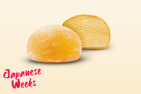 Japanese dessert of mochi rice dough, one filled with mango sorbet and one with matcha ice cream with the taste of green tea.