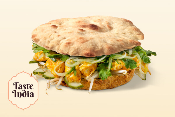 Broodje met zachte stukjes kip (vegan mogelijk), bombai curry sauce, taugé, frisse komkommer, zoetzure komkommer en koriander