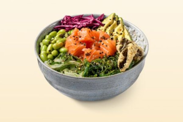 Poké bowl met sushirijst, verse zalm, avocado, wakame, edamame bonen, zoetzure rodekool, komkommer, Aziatische kruiden, tempura crisps en dressing naar keuze.
