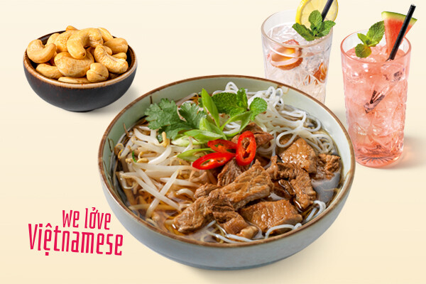 De beroemde Vietnamese noedelsoep met biefstuk, rijstnoedels, bosui, taugé, koriander, munt en verse chilipeper naar keuze. De maaltijd is helemaal compleet met de cashew noten en een Vietnamees drankje naar keuze.
