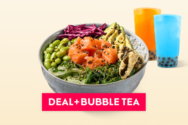 Poké bowl salmon met sushirijst, avocado, wakame, edamame bonen, zoetzure rodekool, komkommer, Aziatische kruiden, tempura crisps en dressing naar keuze. Inclusief bubble tea naar keuze.