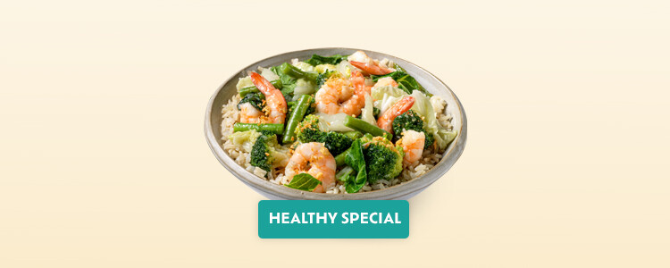 Garlicious saus, garnalen, zilvervliesrijst, paksoi, ui, sperziebonen, chinese kool, extra chinese kool, broccoli, extra broccoli, topping van gebakken knoflook. Samengesteld door Naomi Brinkmans, sportdiëtiste bij o.a. de KNVB.