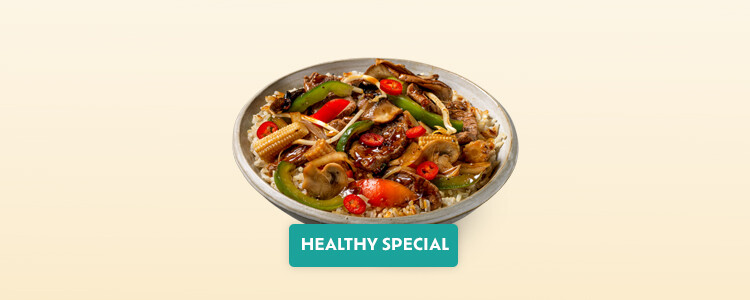 Black chilli, biefstuk, zilvervliesrijst, champignons, broccoli, taugé, ui, paprika, baby maïs, topping verse chillipeper. Samengesteld door Naomi Brinkmans, sportdiëtiste bij o.a. de KNVB.